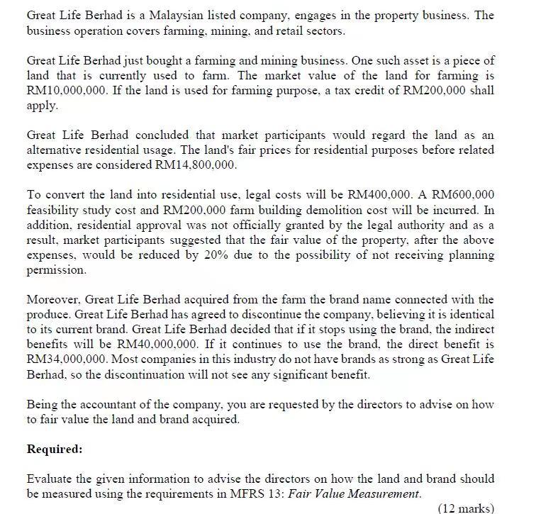 Solved Great Life Berhad Is A Malaysian Listed Company Chegg Com